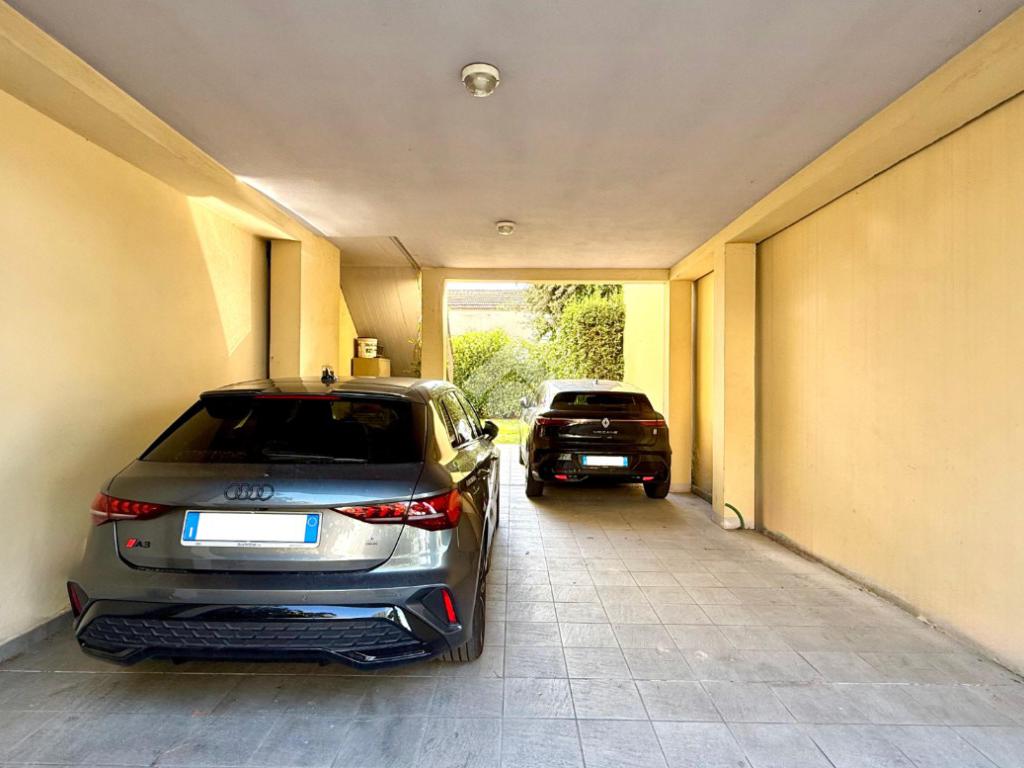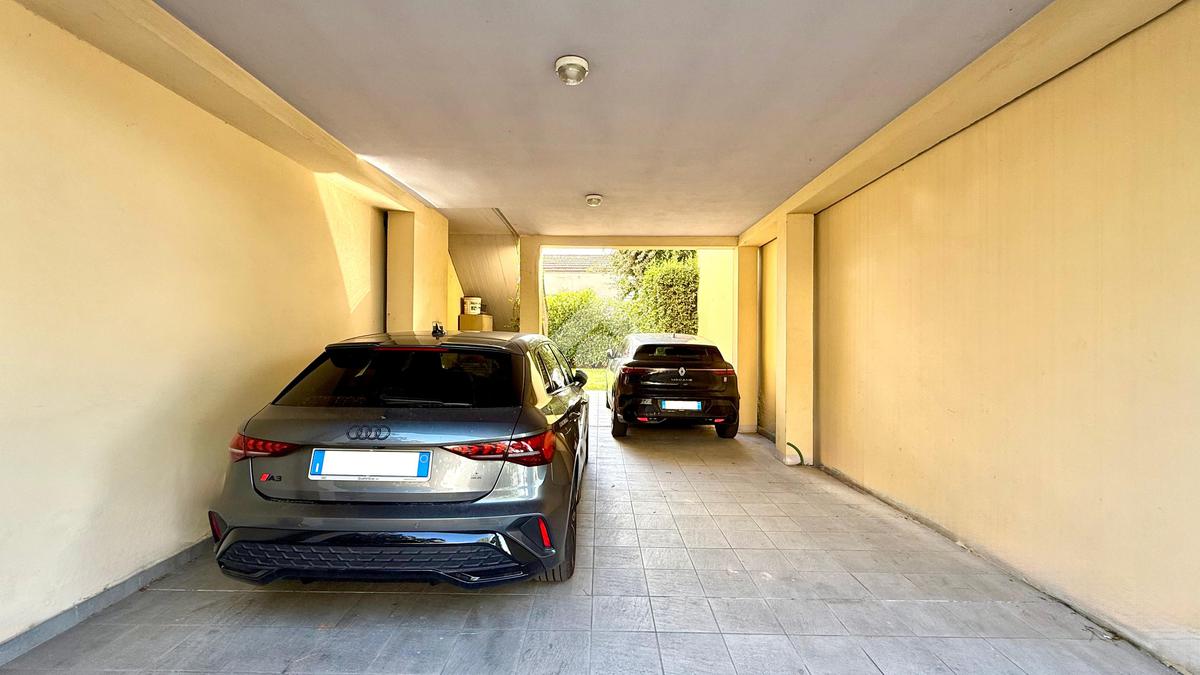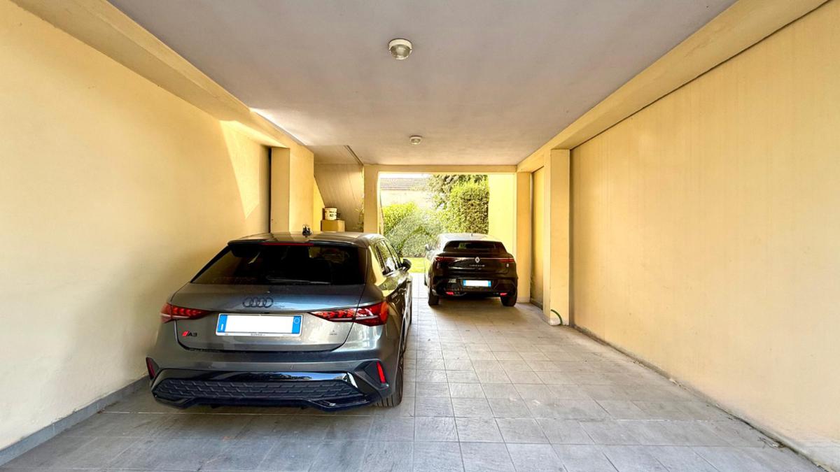 Al piano terra, la bifamiliare dispone di spazi esterni condivisi con l'altra uità abitativa, suddivisi equamente, che comprendono una porzione del giardino ed un posto auto per ciascuna abitazione.