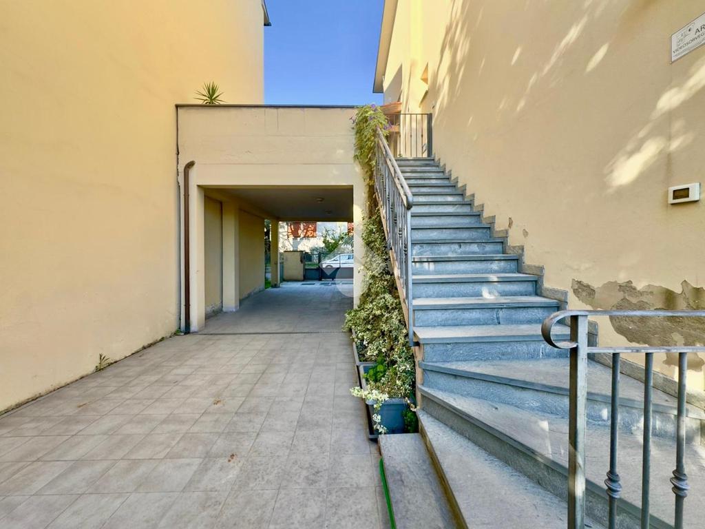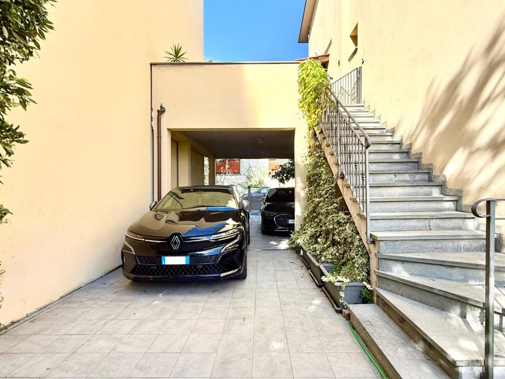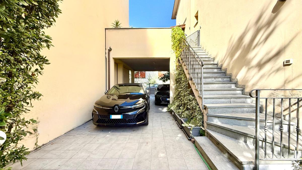 La palazzina gode di un ampio spazio esterno al piano terra in comune tra le due unità con accesso carrabile per i posti auto e il giardino.