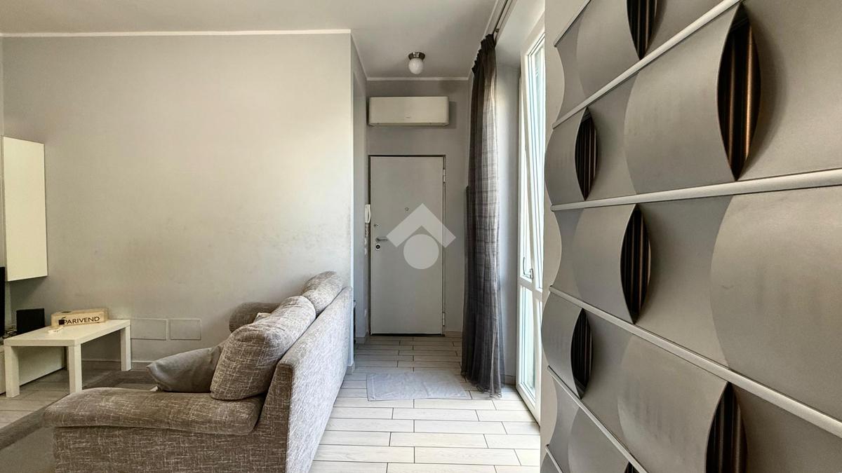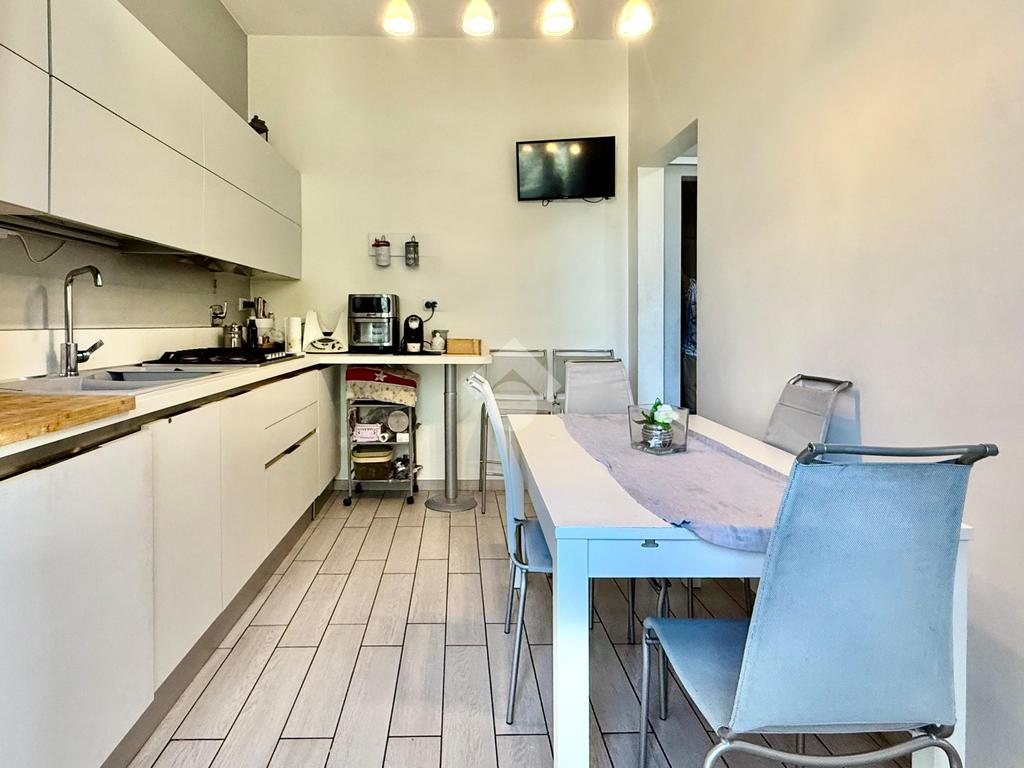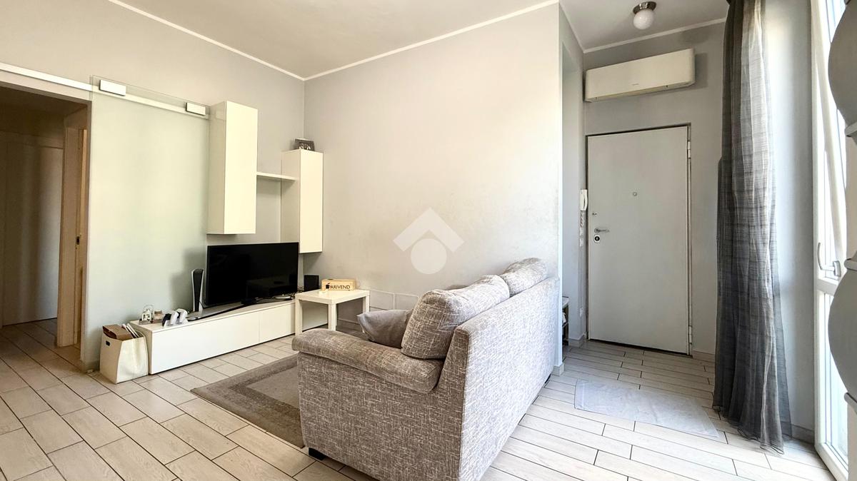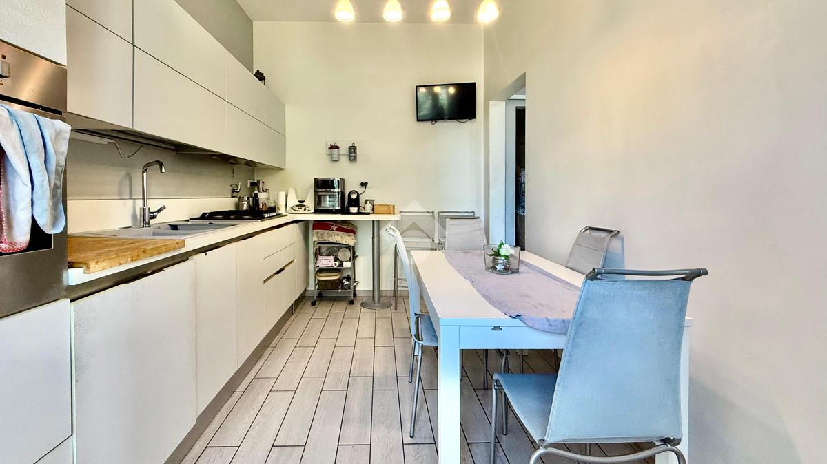 All'ingresso si sviluppa la zona giorno con living e cucina, entrambe illuminate dalle due porte finestre che si affacciano sul balcone.