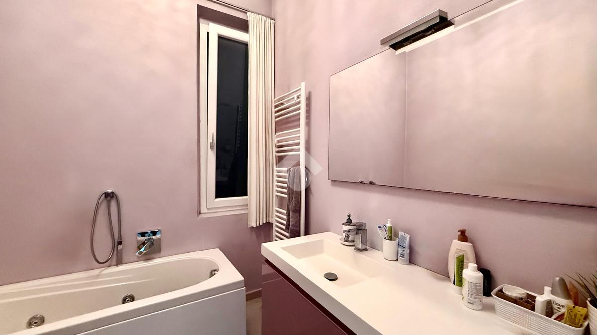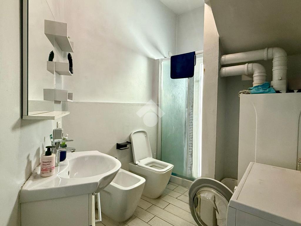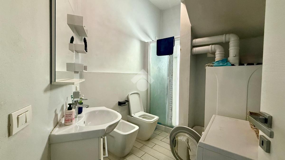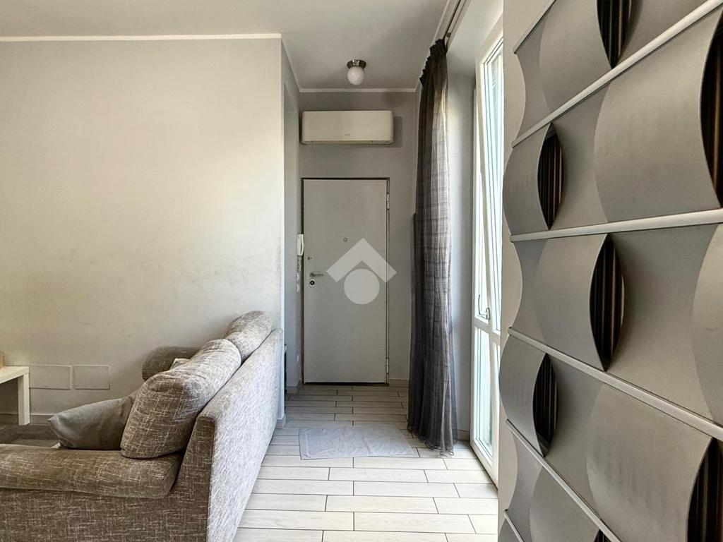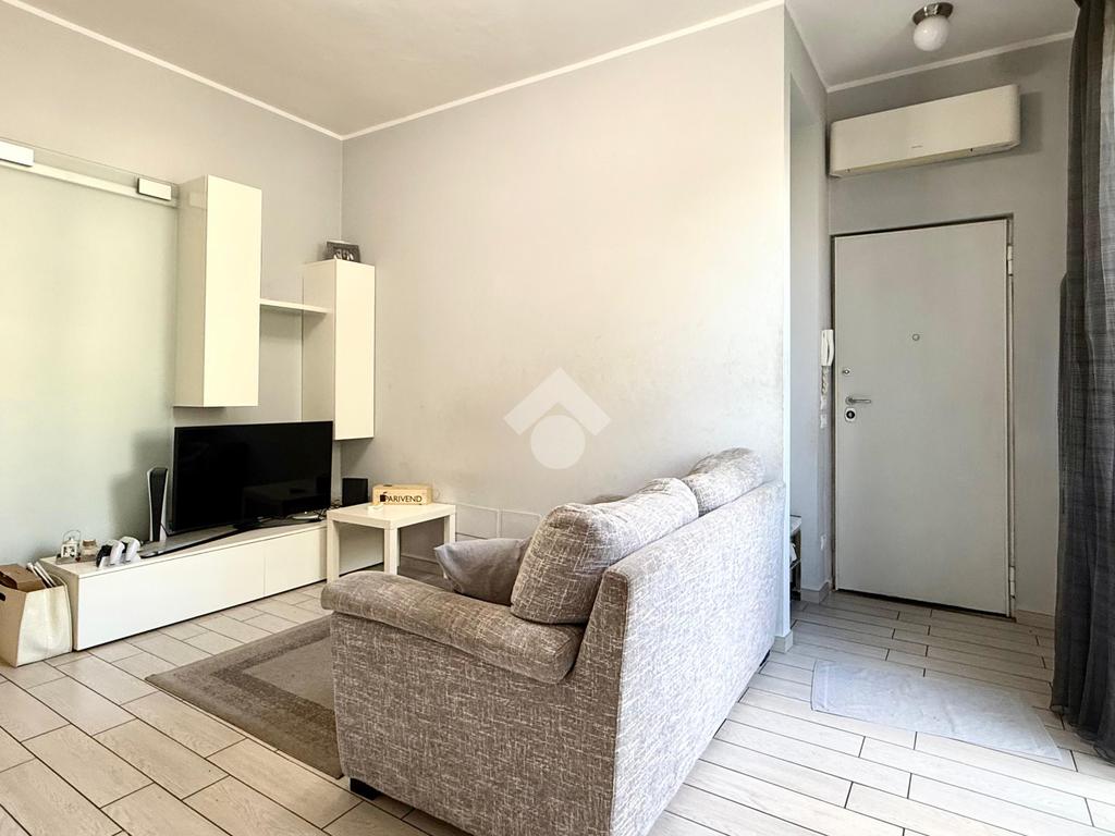 All'ingresso si sviluppa la zona giorno con living e cucina, entrambe illuminate dalle due porte finestre che si affacciano sul balcone.